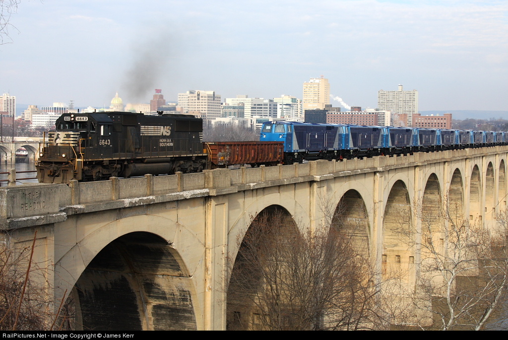NS SD60 6643 leads 12 new Egyptian Railways ES40ACi's across the other famous bridge in the Harrisburg area. If you look closely you'll see the name of the company who owned the bridge for years.. Long live the READING!!!