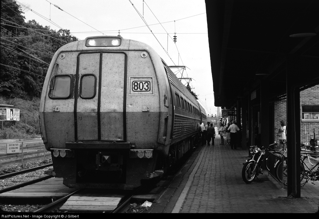 Amtrak 803 and sister make an eastbound stop at Paoli on a warm July afternoon in 1981. 803 was later converted to cab car 9642, and then became DOT T-16. For more, see images 58753 and 20493 on Railpictures.net, as well as http://www.fra.dot.gov/us/content/420