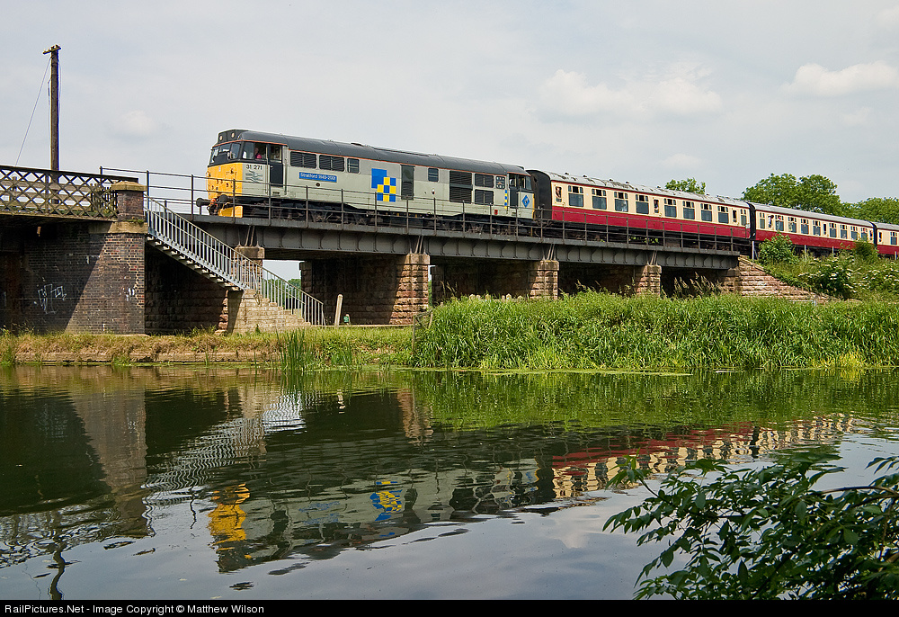 | In a recently restored trainload livery, 31271 runs across the River Nene and into Wansford station with a weekend service train |