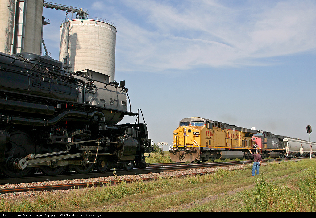 Fancy meeting you here. A UP 3985 crew member gives a wave to the crew on board UP 7306, which leads UP 6346 (a former SP AC4400CW) and a grain train westward through Thumel. After the 7306 is clear, eastbound Challenger 4-6-6-4 3985 will emerge from the shadows of the DeBruce Grain elevators and cross over onto the westbound main, due to trackwork.