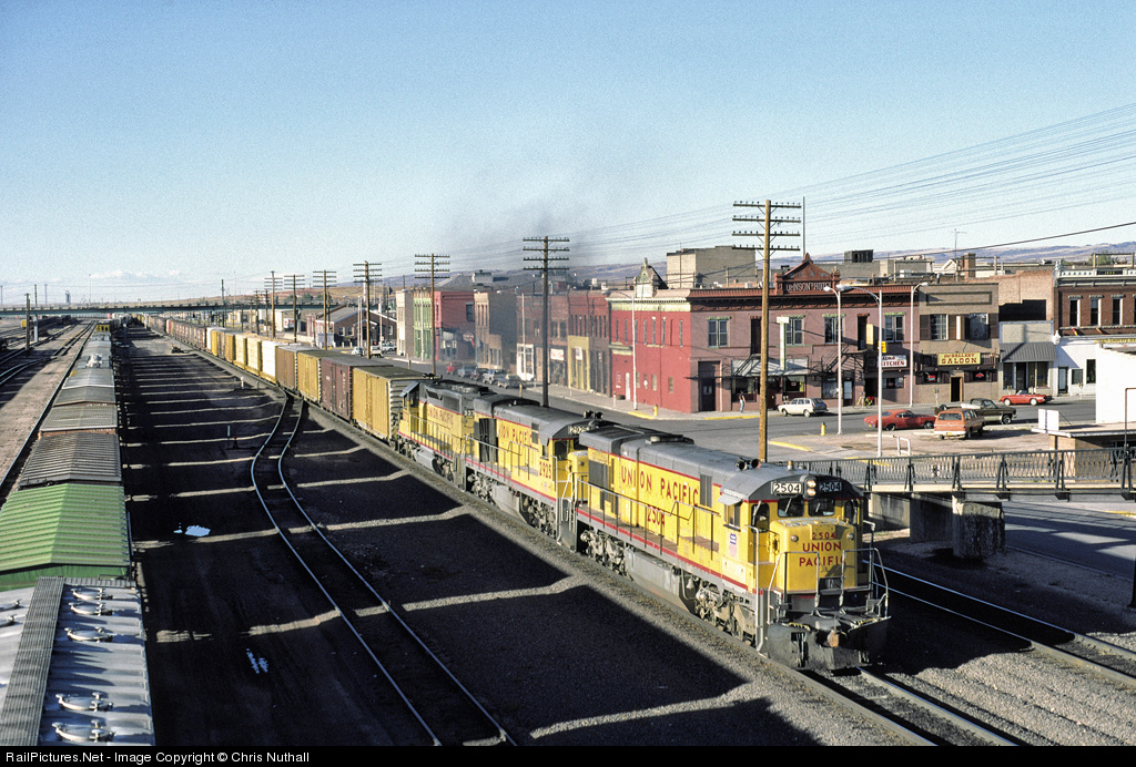 | Fighting lengthening evening shadows, 2504 2925 3272 run an eastbound freight through Laramie in September 1985 |