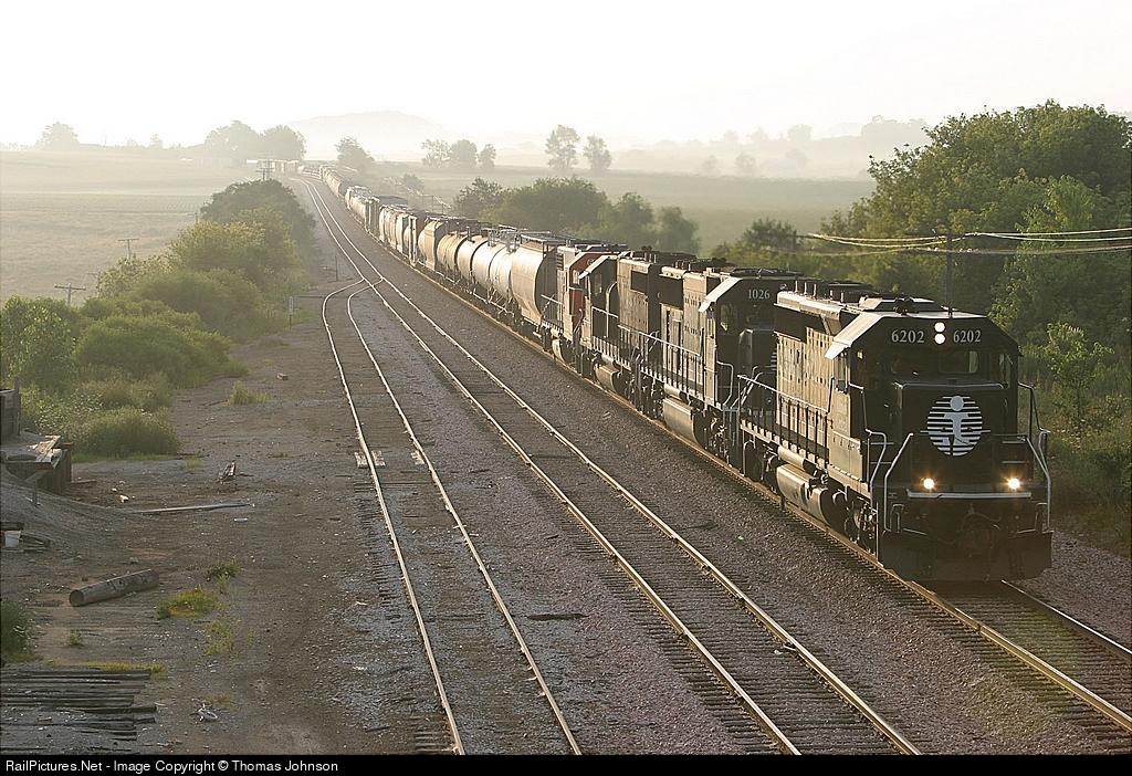 | Daily freight train from Champaign, IL - Waterloo, IA crests the hill westbound into Scales Mound. |