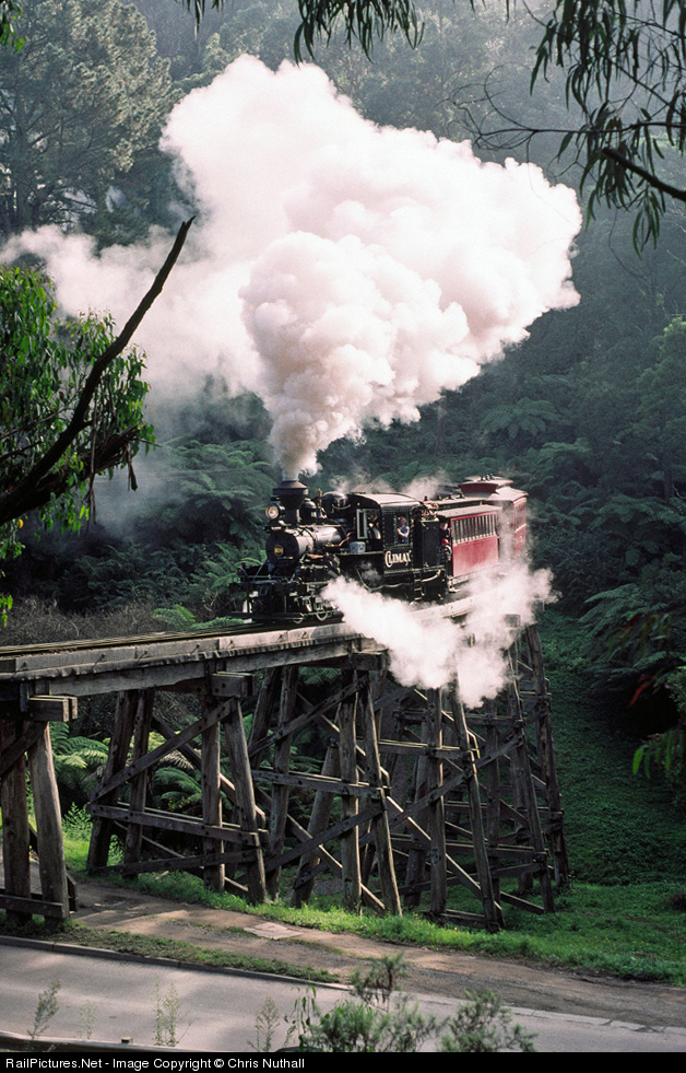Climax 1694 of 1928 crosses the famous Monbulk Creek trestle bridge near Belgrave on a Commissioners Special in May 1996 on the Puffing Billy Railway. This locomotive is currently under restoration - for more details see http://climax.puffingbilly.com.au/index.html