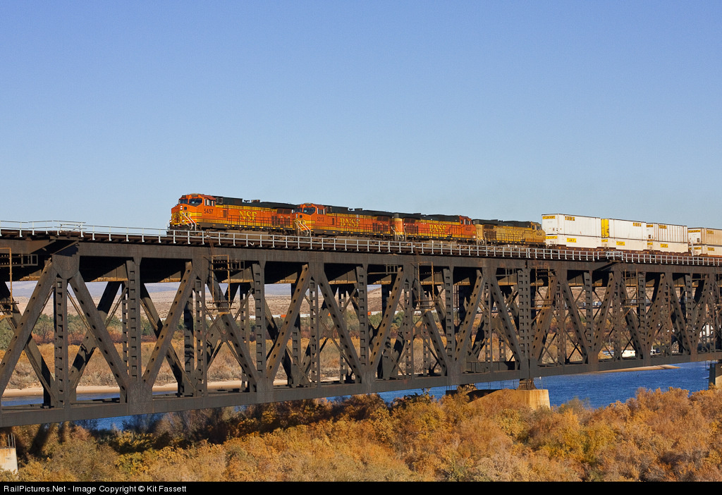 The long lost Northern Santa Fe railroad? 5457 is missing it's "B" in "BNSF" as it crosses the Colorado River. You can see the tail of the train between the girders on the Arizona side of the river.