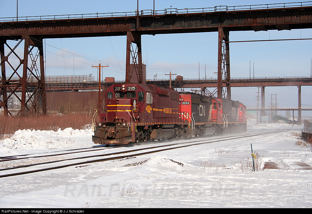 | A DMIR SD38 leads 2 CN units under the massive docks in Duluth, MN on a bitterly cold, -15 degree afternoon. |