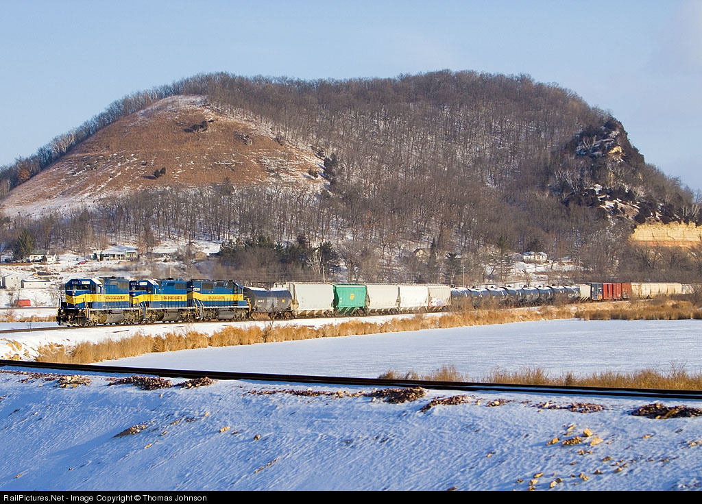 An "icey" morning: freezing rain overnight coated the roads thick with ice and three ICE engines on today's MSPKC. This train normally runs with two engines between St. Paul, MN and Marquette, IA. In this image they are rolling south across the frozen Reno Bottoms.