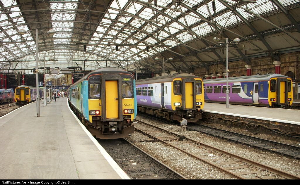 | 4 Class 156 DMU's display 3 different liveries, 2nd left is 156498 in the now obsolete Northern Spirit livery. next is 156425 in the first incarnation of Northern Rail's livery, and finally on the extreme left and extreme right are 2 classmates in the final version. |