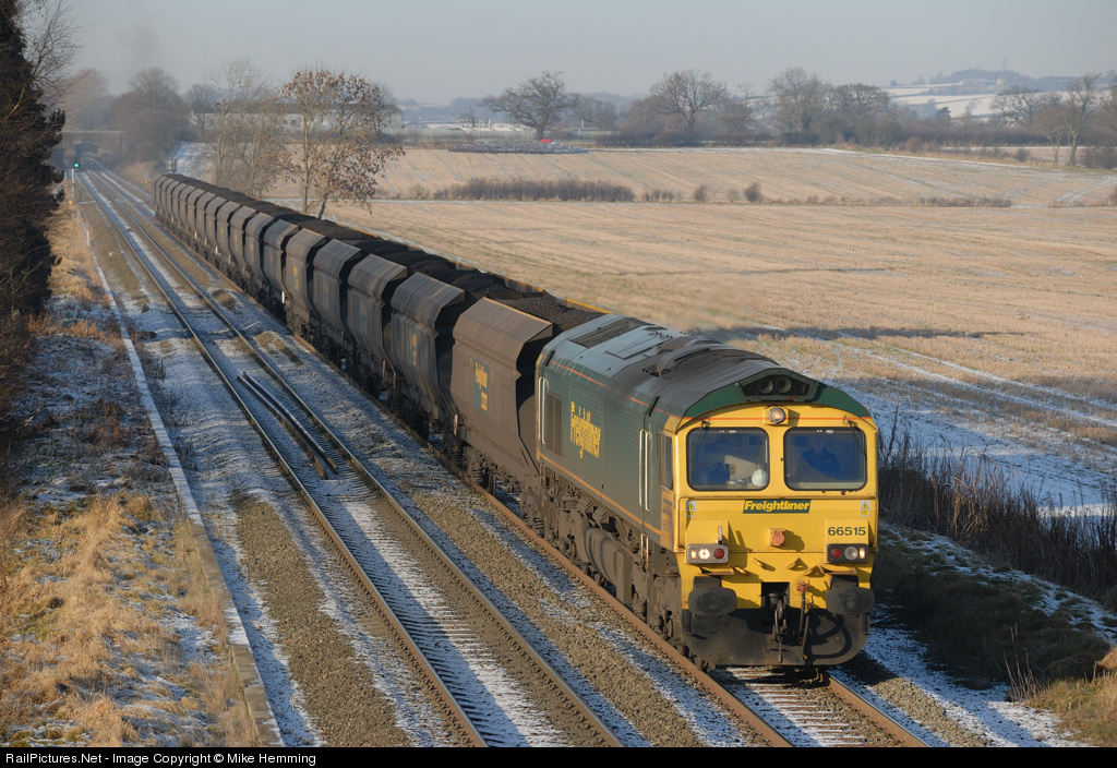 66 515 is seen in the Shropshire recent cold snap while woring 6M55 imported coal for Rugeley Power Station.
