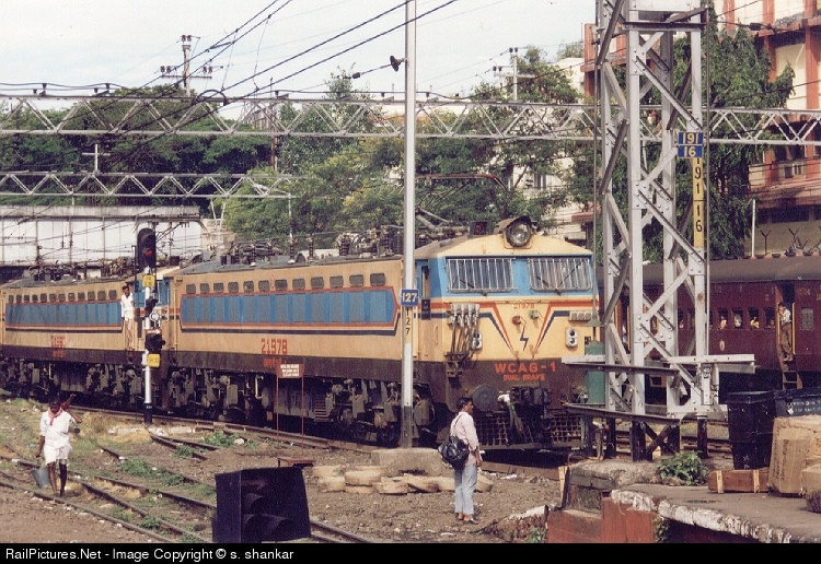 A pair of WCAG/1 dual current dc/ac electric freight locomotives runs light through Poona (Pune) in Western India after having brought in a heavy freight train. This class of loco had just come out at that time .