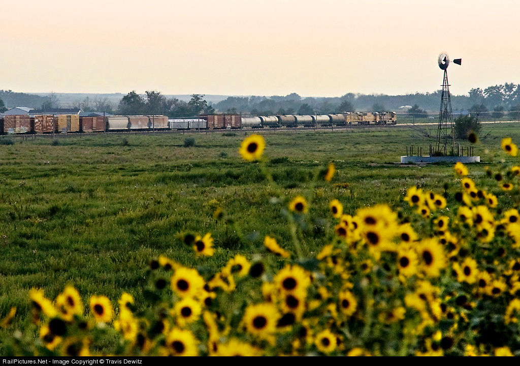 With the sun getting ready to set, the flowers stretch to get the last rays of the day as a Westbound freight rolls by in the distance.