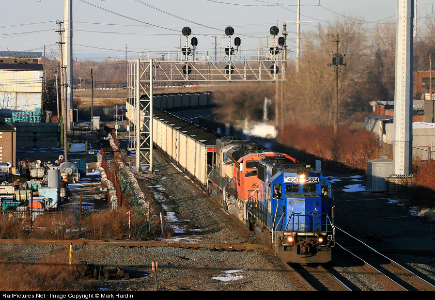 Coal loads bound for Mingo Juction, Ohio with a nice mix of power are crossing the old Erie main into Cleveland, now known as NS's Randall Secondary. Note, the scrap yard to the left of the frame with the razor wire guarding the property from would be thieves, reminds me of the fences around a prison.