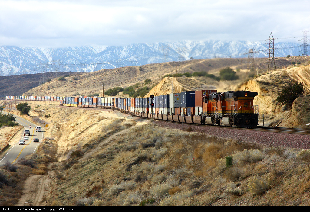BNSF 4041 is one of two DP units pushing a loaded stack train up the east slope of Cajon Pass, and then holding it back when descending the west slope into the LA Basin.