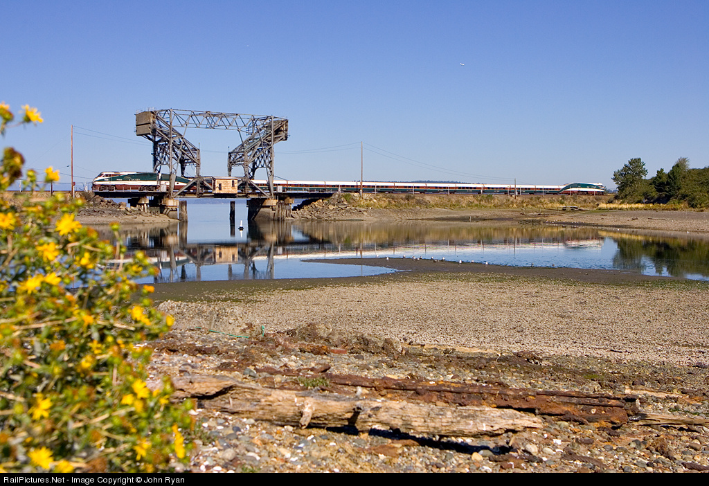 | A southbound Cascades Service train set pounds the Steilacoom drawbridge. Of particular interest are the heavily corroded rails buried in the channel. You can see a fishplate and several bolt holes. Judging by the size of the rail, these appear to be very old. I can only guess as to how they wound up buried here. |