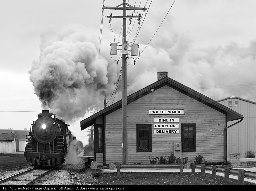 | Soo Line 1003 passes by the old North Prairie Depot. Photo charter sponsored by Historic Transport Preservation and Soo Line 1003, LLP. |
