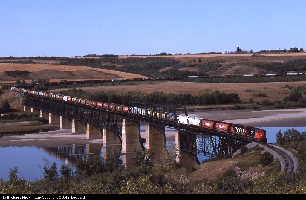 Eastbound grain empty train 818 crossing the massive bridge over the North Saskatchewan River west of North Battleford. This in on the secondary main known as the Prairie North Line.