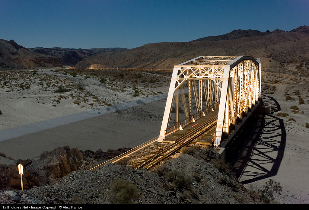 A westbound stack train blasts through a bridge at the eastern entrance of Afton Canyon under a pretty full moon.