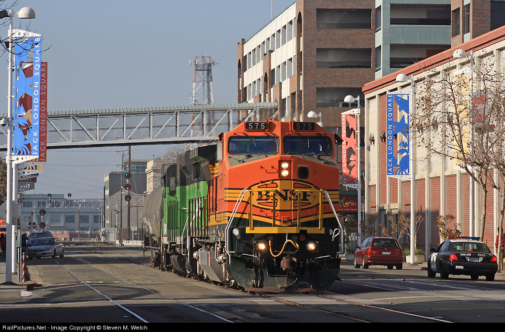 One can wish, right? I wish.... The GP30 trailing would have been leading, but, as the Rolling Stones once said... "You can't always get what you want, but if you try sometimes, you might just find, you get what you need." BNSF 575 and a GP30 lead a lone ethanol tank down Jack London Square, with one of Oakland's finest cruising down the Embarcadero. Canon Rebel XS.