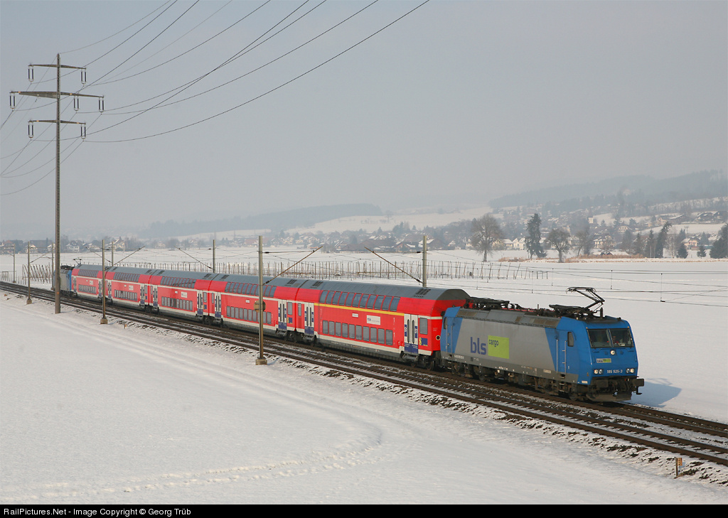 | Because of too late delivery of the new "Lötschberger" trainsets, the BLS has a doubledeck train with cars of Deutsche Bahn in service on the S-Bahn line 1 Fribourg-Berne-Thun to free NINAs from there. The train has a locomotive type 185 of BLS Cargo (leased from Angel Train Cargo) in front and in the rear. |