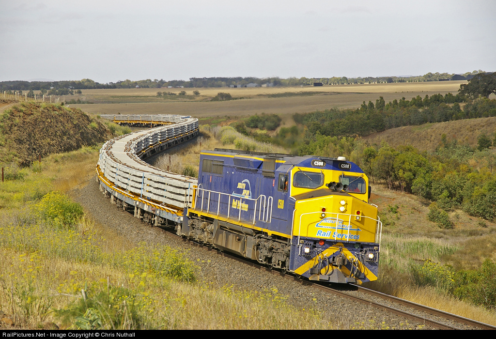 As one of Australia's closest cousins to an SD40, C508 wheels a long train of concrete sleepers through the S curves at Murgheboluc, near Geelong. To assist with the 2,640 tonne load, ALCo 80s1 is pushing in the rear, out of sight.