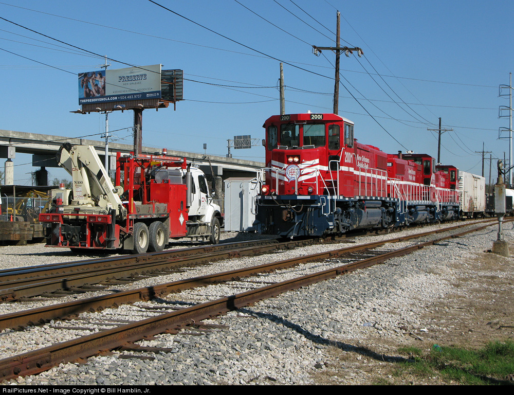 A transfer run from the New Orleans Public Belt to U.P's Avondale Yard creeps by a CN Hi-Rail truck as it approaches Central Avenue crossing on it's way up the Huey P. Long Bridge. This shot offers a good look at the NOPB's 100yr Anniversary paint livery.