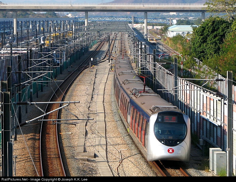 | A train for Nam Cheong on the West Rail Line, which will be extended to Hung Hom later this year. Pat Heung Maintenance Centre is on the left where you can see a number of trains under maintenance. |