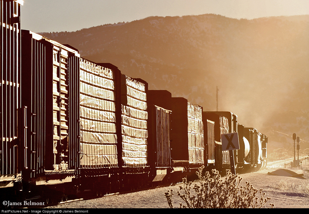 | Got glint? Captured moments after sunrise, Union Pacific's daily Salt Lake to Denver manifest charges east into the morning sun through Utah's scenic Spanish Fork Canyon. Today's train with a nice mix of cars is approaching CP RG672, Narrows on the former D&RGW Salt Lake to Denver mainline. |