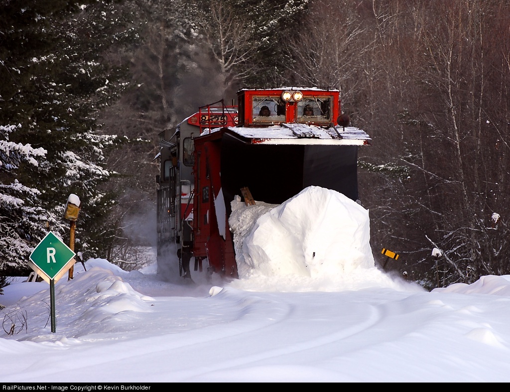 Pushing quite the snow pack - MMA Plow Extra 8525 heads around the curve on the Millinocket Subdivision as it heads south for Derby, ME.