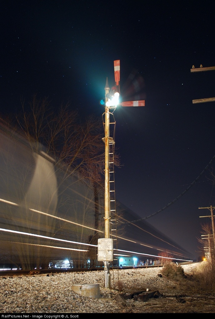 J772 knocks down the northbound signal at the north end of Orleans as they head toward Mitchell. Exhaust from the passing locomotives creates a green glow around the spire and lens. You cannot find a Dash-7 passing a semaphore signal just anywhere in 2009 railroading!