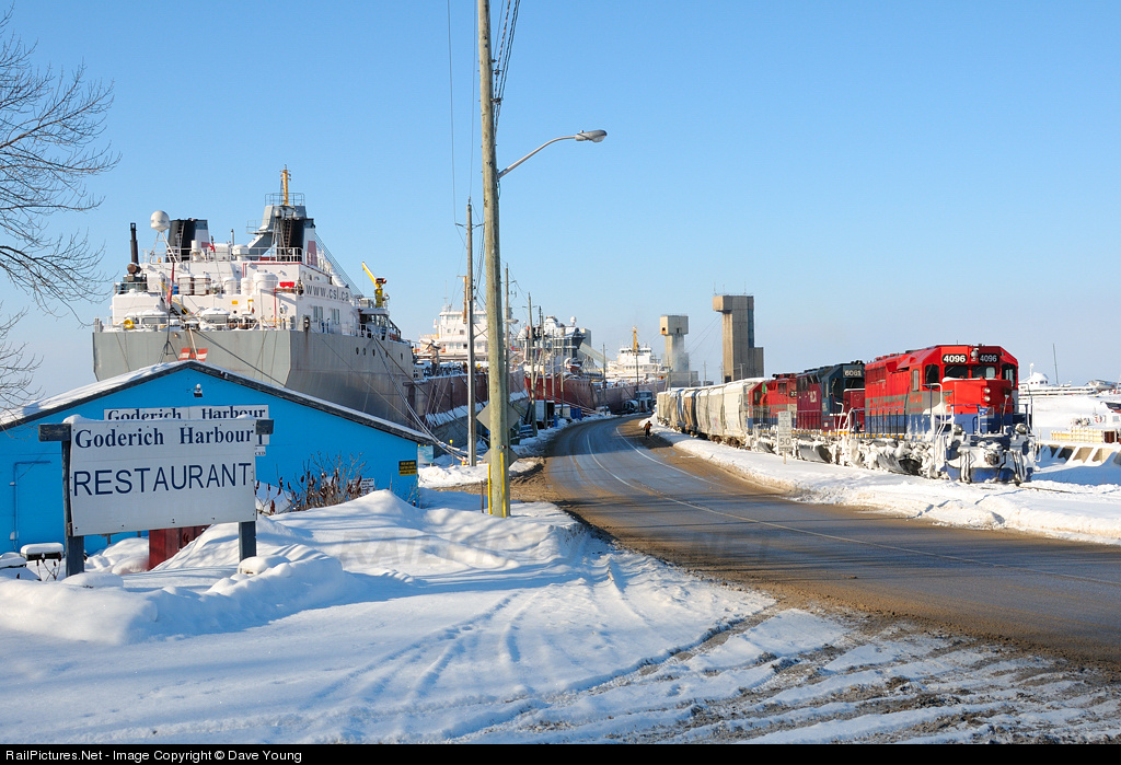 | Ships are tied up for the winter, but the trains continues to roll into the harbour at Goderich. GEXR 581 is about switch and pull cars up to the yard in Goderich. |