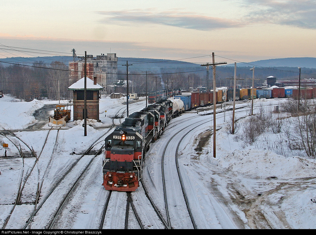 | As dusk settles over the Berkshires, B&M GP40 335 and four sisters depart westward out of a snow-covered East Deerfield yard. There is plenty of power sitting on the ready track in the distance and the plow sits by the abandoned tower, waiting for the next snowfall. |