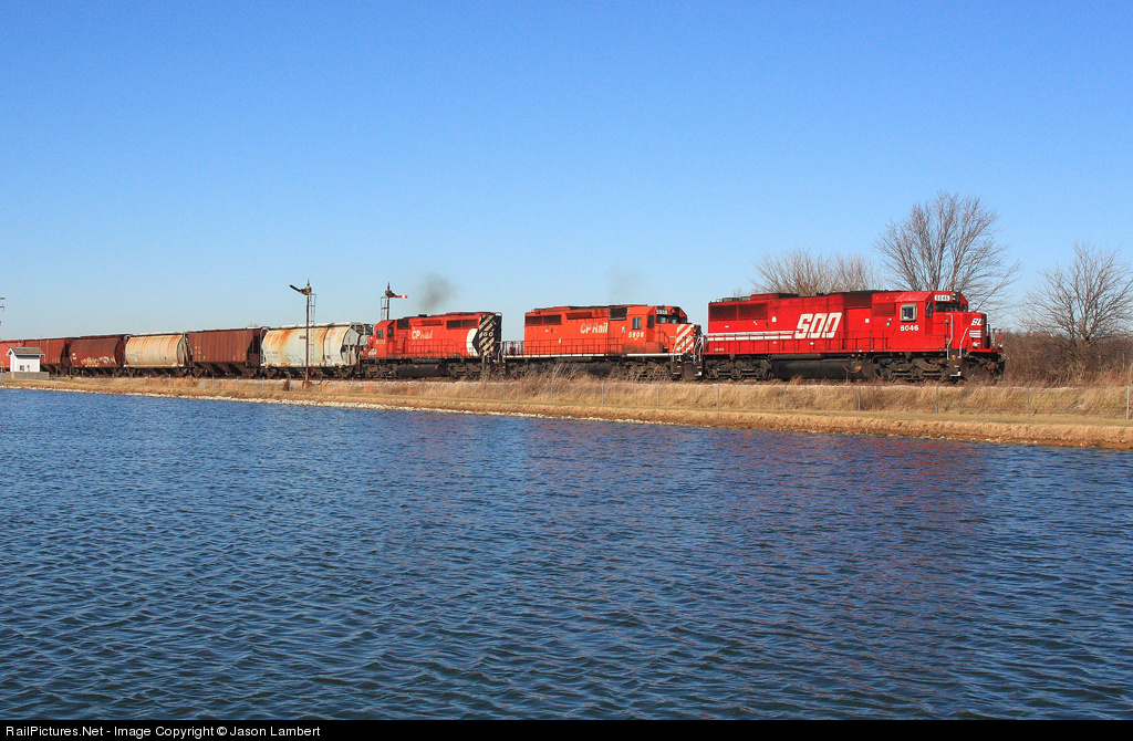 | INRD's PASHLV is bound for Louisville with a Soo SD60 and two CP SD40-2's. The trailing unit, 6042, is in the Pacman scheme. |