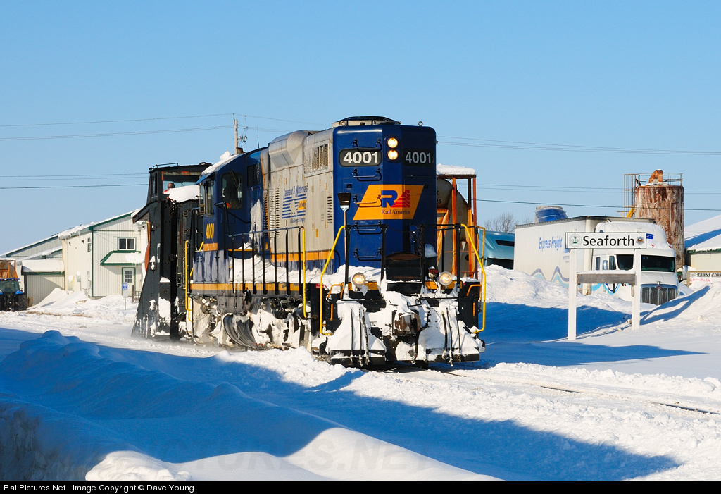 | After plowing the line mostly under the cover of darkness, RLK 4001 leads ex CN plow 55413 through downtown Seaforth, kicking up a bit of snow. |