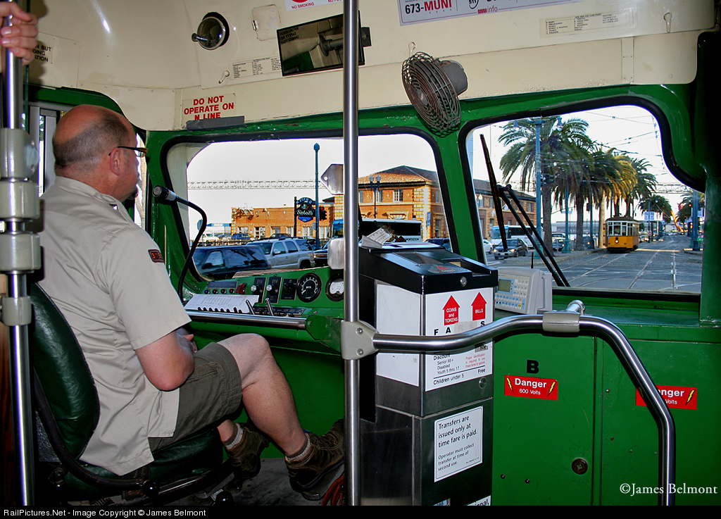 The driver of MUNI car 1007 prepares to hang a 'hard right' along the San Francisco Ferry Building at the Embarcadero. Our MUNI driver on this day was very entertaining, offering numerous anecdotes to a carload of wide eyed tourists from around the world.