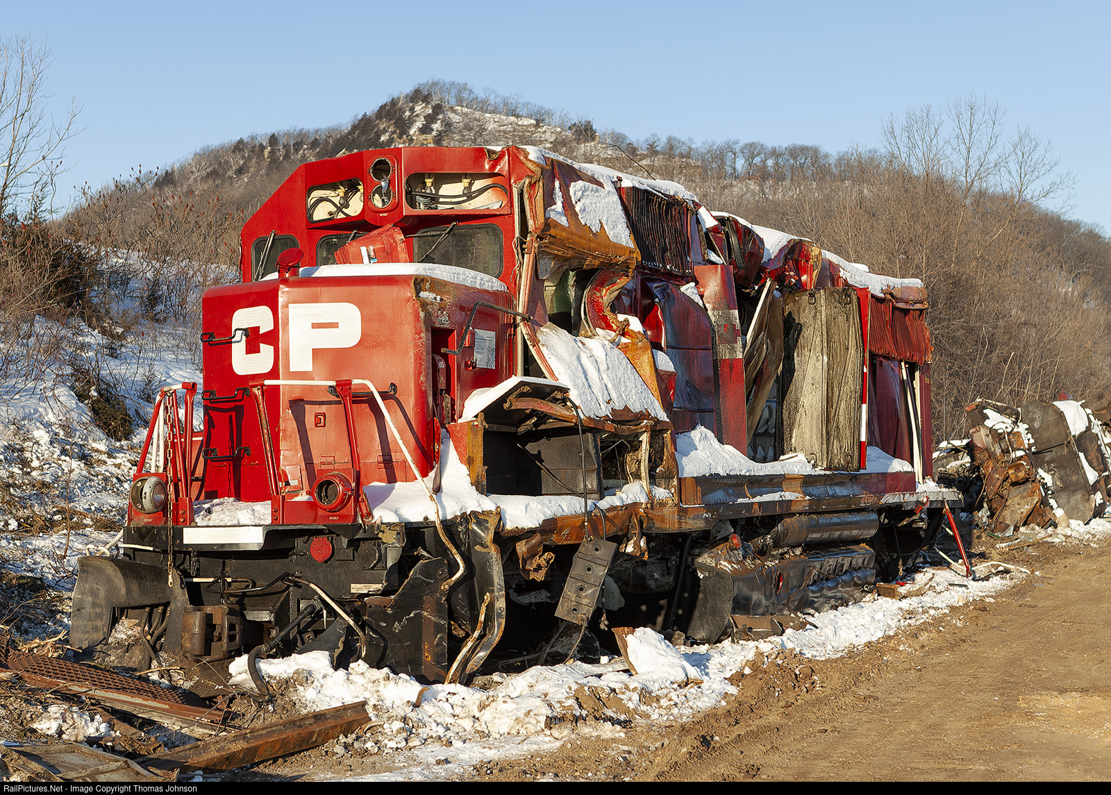 | After being pulled from the Mississippi River, the CP 4520 still remains at the scene of a derailment that happened on 12/17/2008. The remnants of SOO 4648 can be seen in the background. Around 0500 on the 17th, CP train G80 ran into the side of CP train 487 which was pulling out of the siding at River Junction West. |