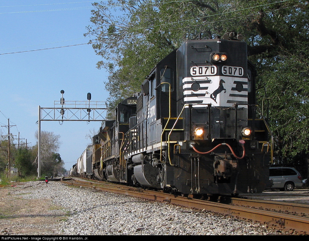 | Rumbling quietly (a "No Horn" zone) through Old Metairie, a high hood NS unit approaches Metairie Road headed for the bridges over the 17th Street Canal and I-10 - past the cemetaries. Thanks to my friend James Robichaux for the following info and train ID: