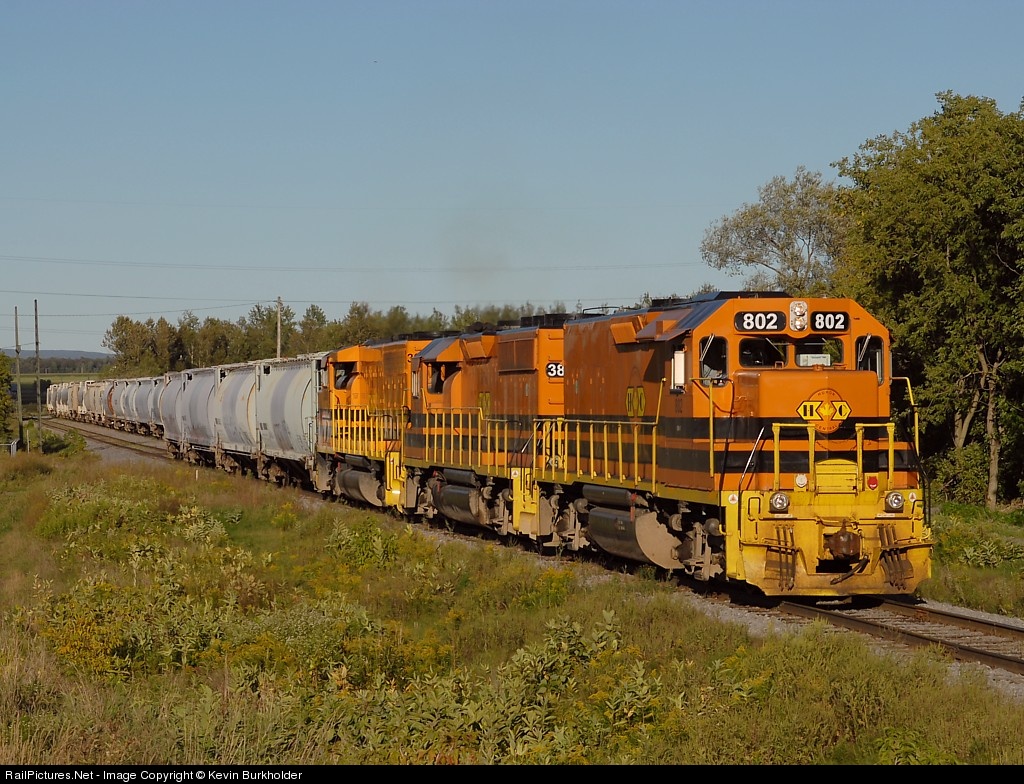 | The afternoon Quebec Gatineau train out of Quebec City arrives Pont-Rouge, Quebec, on September 25 with Huron Central Road Slug 802 and GP40-2 3802 and a QGRY GP40-2LW. |
