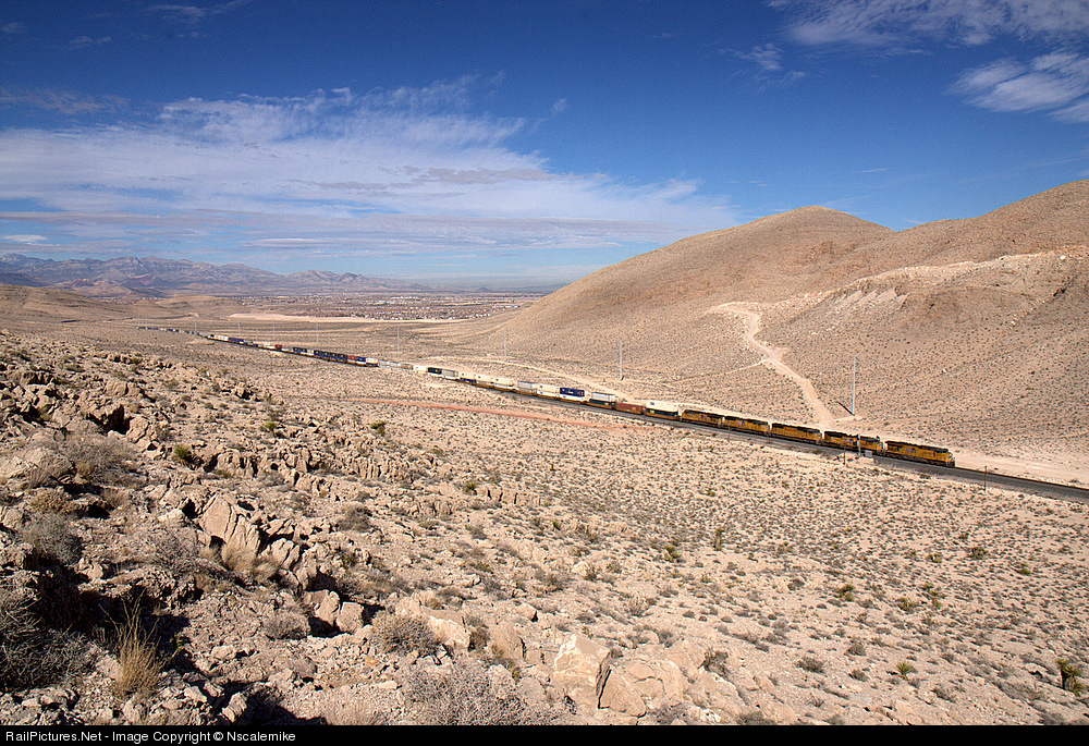 This is a westbound stacktrain, heading for the port of Los Angeles, Ca. UP dispatchers call this train a "No-fitter" since the length of this train exceeds many of the sidings on the former San Pedro, Los Angeles & Salt Lake route.