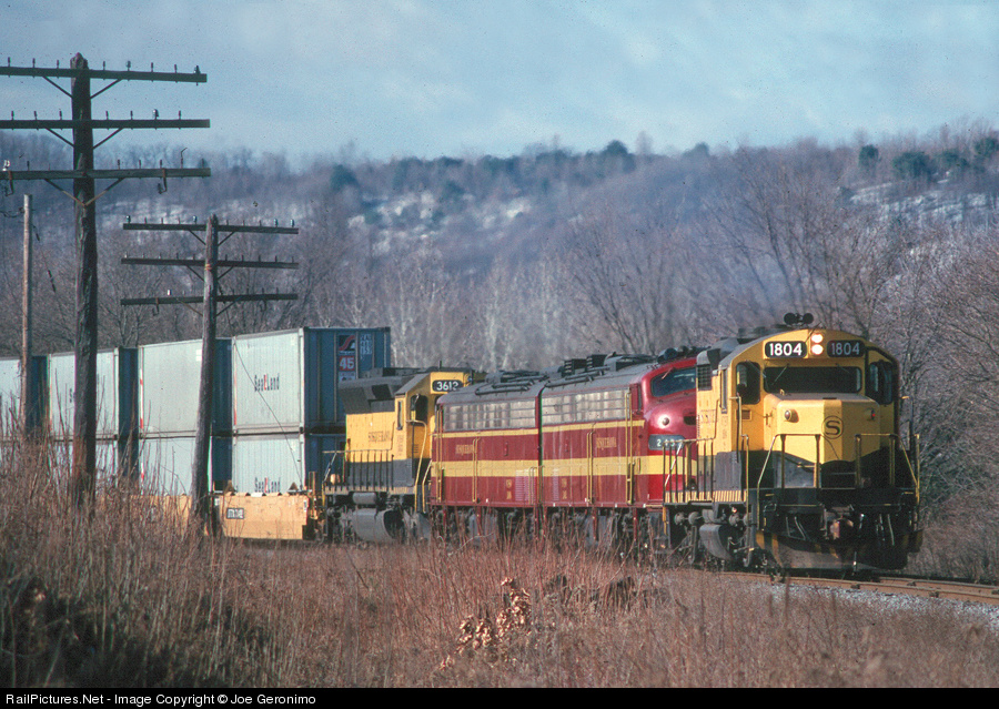 A mix of vintage EMD's lug a heavy double stack train northbound for interchange with Conrail at Syracuse through the sleepy town of Chenango Bridge, NY on the Utica main. Almost twelve years later these four units either have been scrapped, sold or side lined. There is no more Utica main it is now all the Syracuse main. Oh how things change!