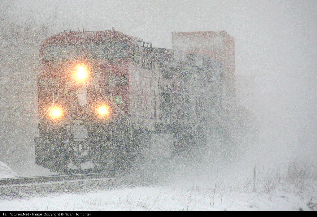 | CP 9638 leads another AC4400CW through a heavy snow fall in Wisconsin Dells, kicking up snow in it's wake and obscuring the train behind it. Only about 15 minutes before this photo there was no snow fall at all, but when the snow started it came quickly and in large flakes. |