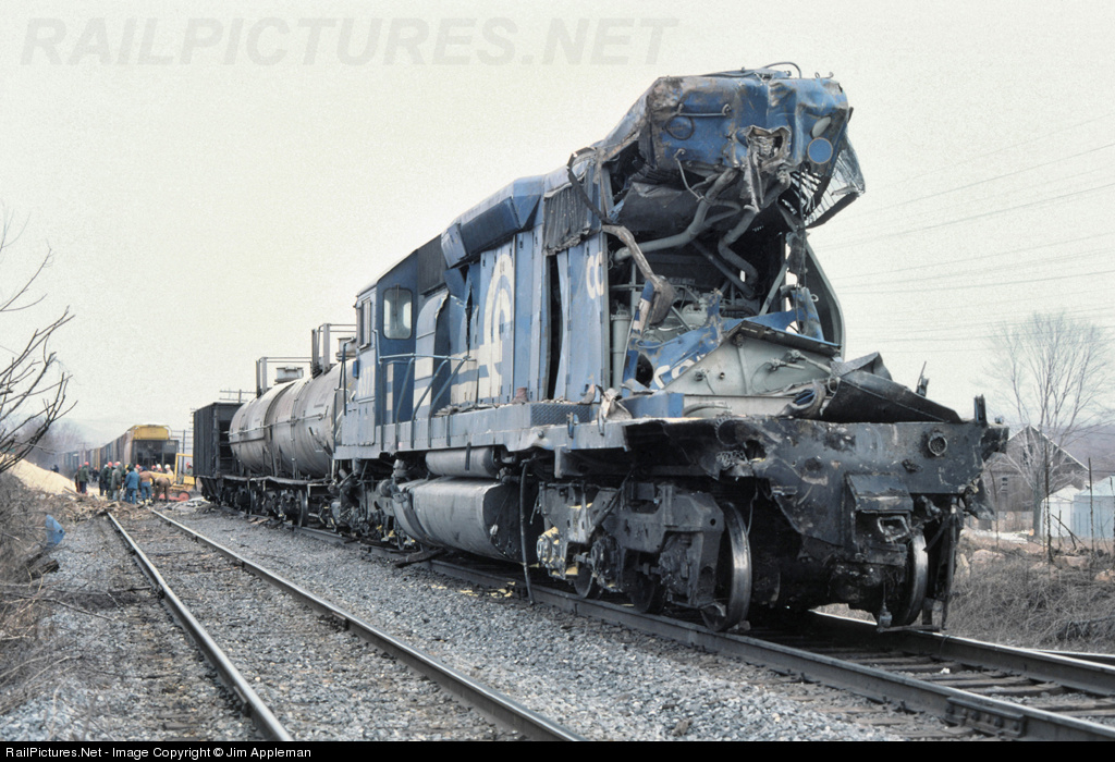 January 31, 1979- CR 6407 was the leader and CR 6377 was the trailing unit of a Buffalo-Enola freight that rear-ended a stopped Syracuse-Enola freight. Both trains were to stop for a northbound freight to pass on the adjoining Muncy Siding. Tragically, the flagman in the caboose of the SYEN-0 and the head brakeman of the CNEN-0 were killed upon impact. Three crew members were injured. Seventeen month-old CR 6407 was scrapped. This view shows the 6377 as cleanup of the wreck site was well underway the following day.