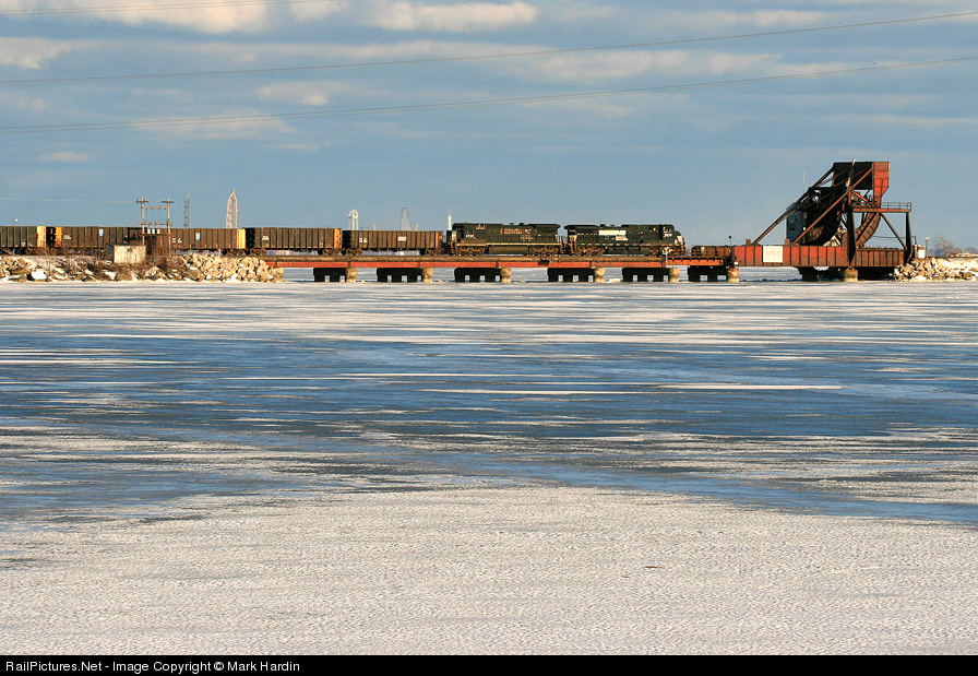 On a very cold winter day, 2009 an empty eastbound gypsum train crosses the cantilever style lift bridge on Sandusky Bay. Note, the roller coasters of Cedar Point can be seen in the background.