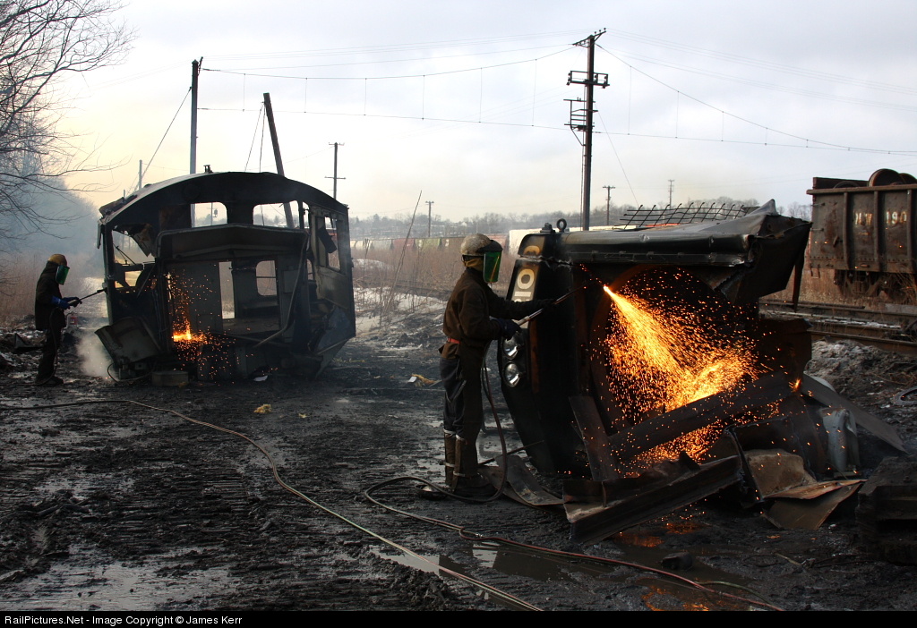 NS SW1001 2109 meets its demise on a bleak Central Pennsylvania day. Unit started life as Reading 2620 built in November, 1973 then was passed to Conrail and renumbered to 9420. NS got posession of her in 1999 and she was wrecked in 2004 and stored till now. Photo taken with permission..