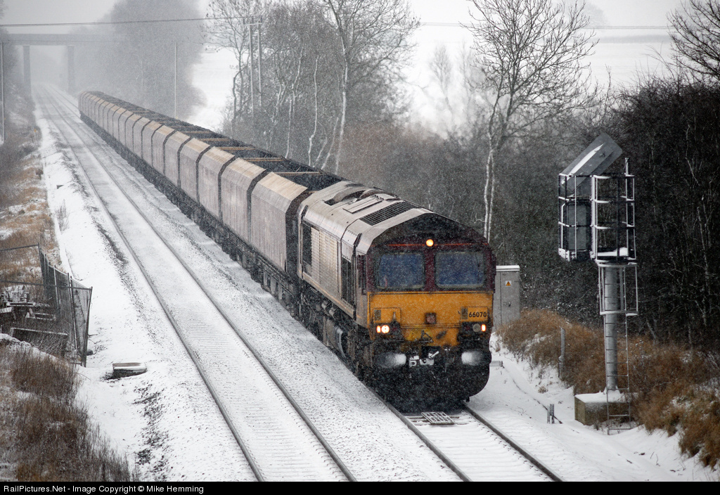| EWS class 66 070 is seen in the snow after slowing for the feather signal giving the driver the right of way to pass onto the Ironbridge branch at Madeley Junction with 6Z59 heading towards Ironbridge Power Station. |