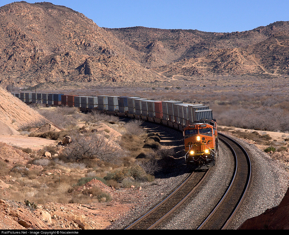 | This is a westbound stacktrain along BNSF's transcontinental route through northern Arizona. After the parade of "Z" trains, (BNSF's highest priority train)...the double stacks were then proceeding through the workzone around Kingman, |