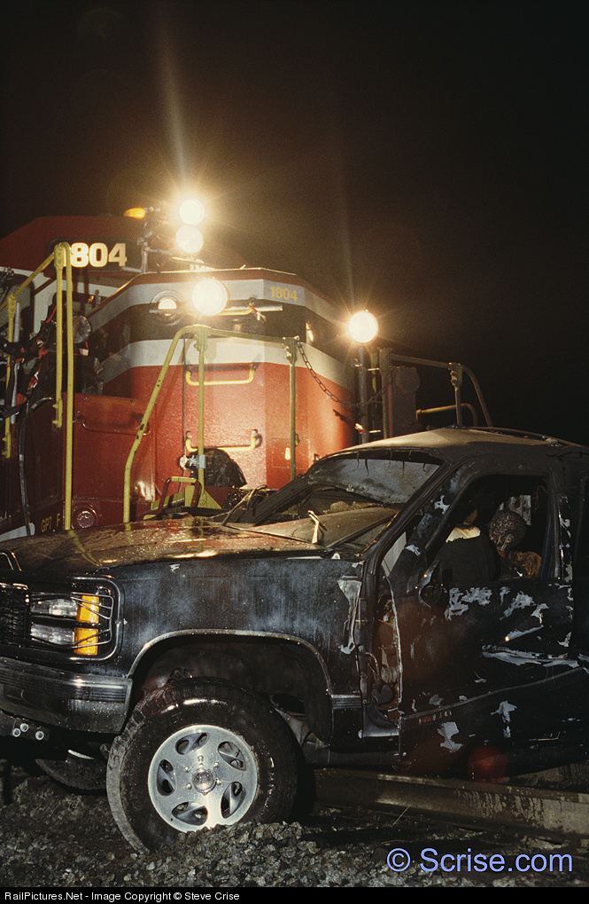 | Aftermath of a staged grade crossing accident between a GP 40 and a Chevy Suburban for Warner Bros. production of “Lethal Weapon 4”. Accident was staged at the North Main Street crossing of the Union Pacific at the Los Angeles River. March 11th, 1998. Accident was staged by the Santa Clarita Railroad (SCRX).