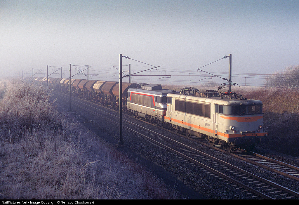 A nice light for a winter morning on the line going to Metz ; this BB 25100 class climbs a small hill with a unit train of and ; Fuji Provia 100F