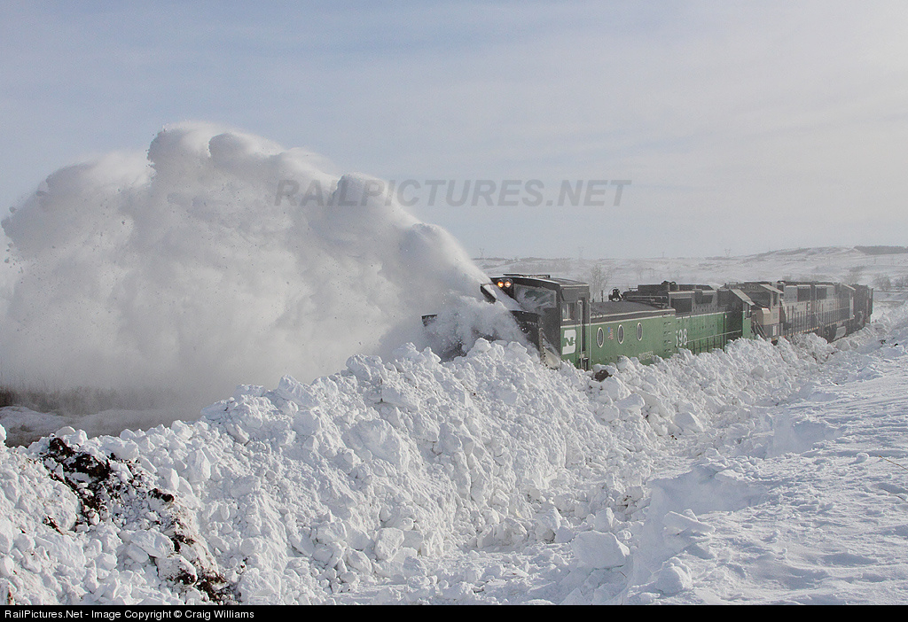 BNSF's rotary works slowly thru the man made snow drift near MP 51 on the Zap Line. Crews worked most of the day digging out the 2 drifts along the tracks at MP 51 and piling the snow on the tracks so it could be blown into the ditch. The rotary plowed at .5 mph using the slow speed on the MAC's.