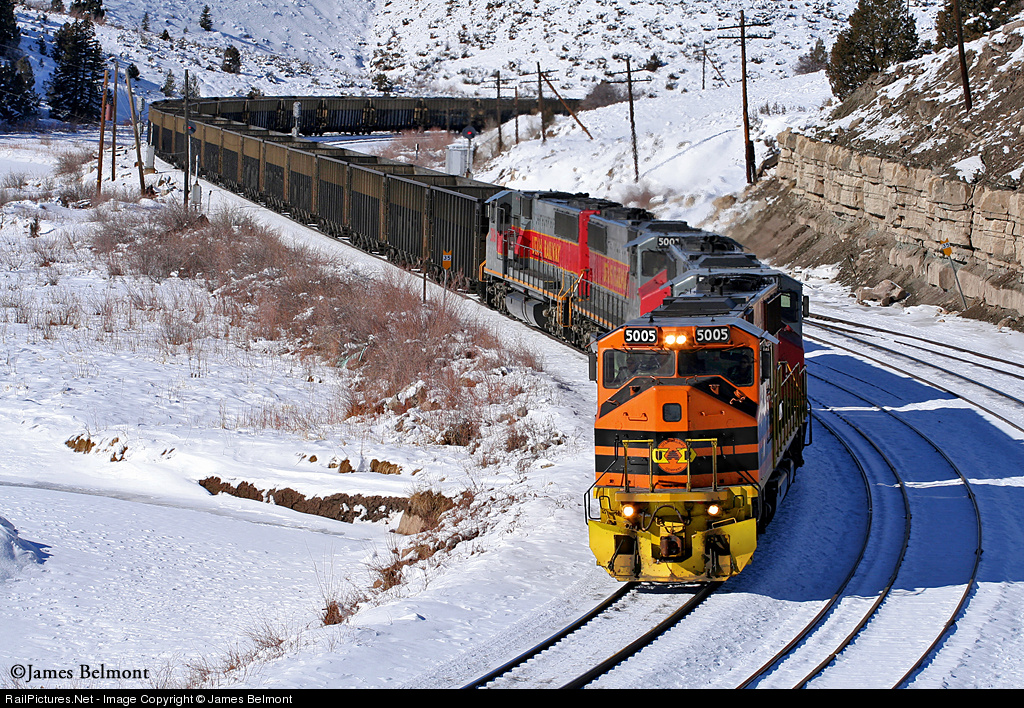 | The one and only orange MK50-3 leads Utah Railway's Intermountain Power to Wildcat coal empty along a snowy Price River at West Kyune, Utah. From this point the descending grade 'increases' from 1.0% to 2.3%. It's time to activate the dynamic brakes...even with a 90 coal empties. |