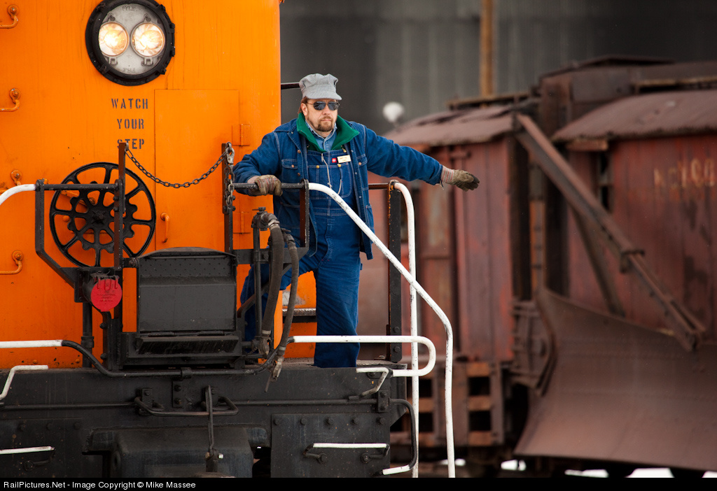 Railroad Brakeman Volunteer at the rear of ALCO RS-3 #109, Nevada Northern Railway.