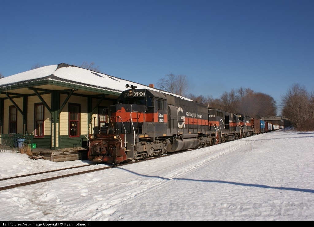 | NMED led by former Illinois Terminal SD39 #2301 heads west past the station in Kennebunk. Also of note is SD26 621, one of only two left in existance. |